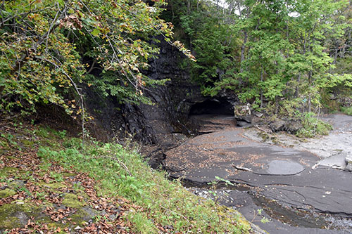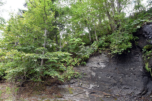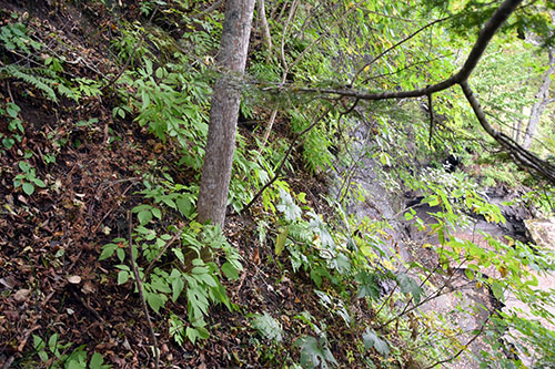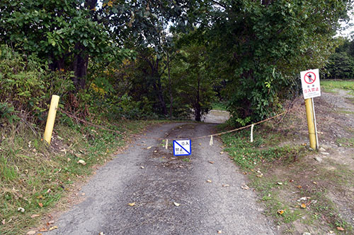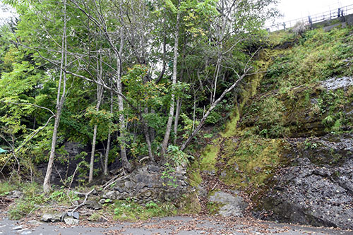 多分ここではないかという場所に行ってみたものの、崖っぷちで危険でもあり、川へ続く道は通行禁止となっていました。その先へ行って場所の確認をしようと思いましたが、雨が降っていたこともあり諦めました。