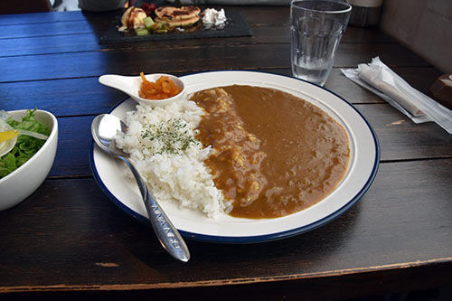 何度か行ったことのある「cafe plus A」というカフェ。ケーキなども美味しい。ここには私がとても気に入っているカレーライスがあるのです。1970年〜80年頃、函館までの長距離列車に乗った時に、その食堂車で食べたカレーライスが、驚くほどマズかったのですが、なんというか妙なスパイスの香りだけの具のないカレー、高級感のない銀の皿、旅のテンションが一気にしぼむ味のカレー、そんなヤバいカレーが、ここでですねっ!! なんとですねっ!! 味わうことができるのですよっ!! ただし・・・