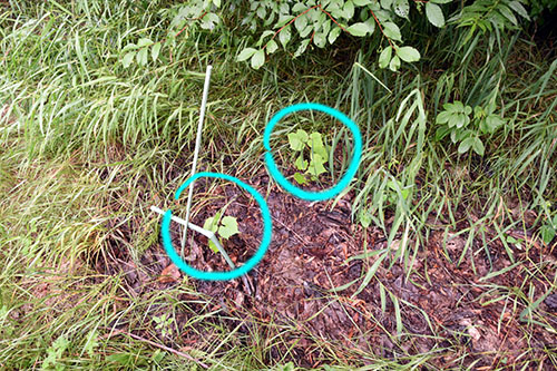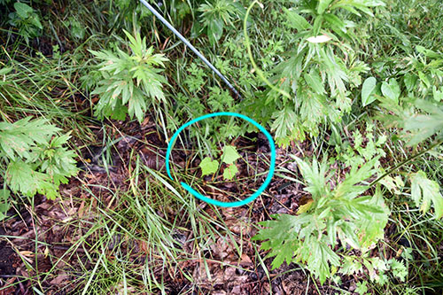 庭にはこの2年ほどで実生が大量に発芽していて、このまま庭で成長すると大変なことになってしまうということもあり、どうにかうまいこと移植できないかと、やむを得ず山の荒地部分の土を耕して肥料を少し入れて移植してみることにしました。その前に我が家の庭の一部・・・