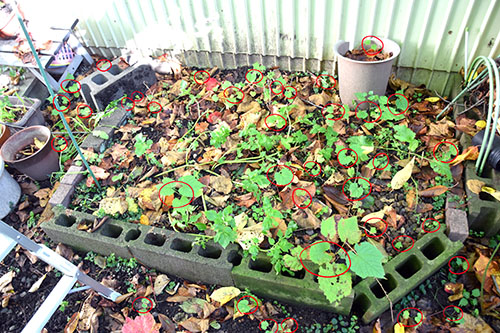 これを2つ作って約60の実生を寒い部屋に移動し、土が乾くので時々水をやっています。こいつらが死んでしまう可能性もなくはないので、地面に残った実生約100株はそのまま庭で越冬してもらいます。その方が自然なので全部ほったらかした方が良いのかもしれません。まぁ室内は実験ですから。